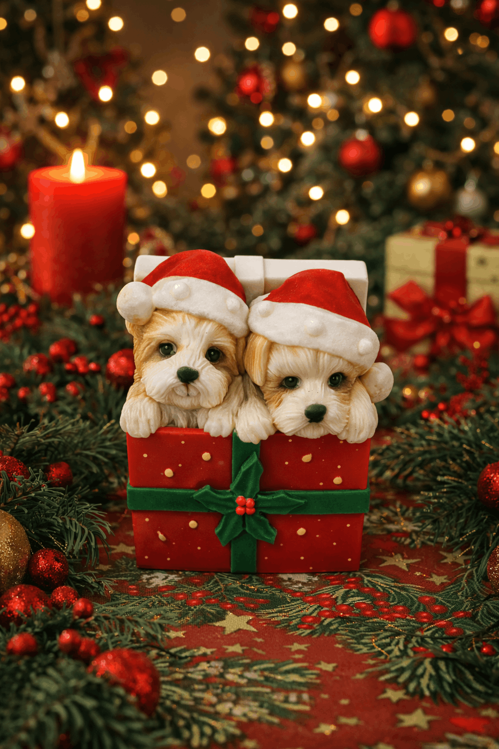 A Kutyusos Ajándék szilikon öntőforma egy különleges, érzelmekre ható, részletgazdag gyertyaöntő forma, amely ideális választás ünnepi, elsősorban karácsonyi hangulatú kézműves gyertyák készítéséhez. A formában két kedves kiskutya bújik meg egy díszes ajándékdobozban, mikulássapkával, finoman kidolgozott részletekkel. Ez a kompozíció azonnal mosolyt csal az arcokra, és tökéletesen visszaadja az ünnepek meghitt, családias hangulatát.