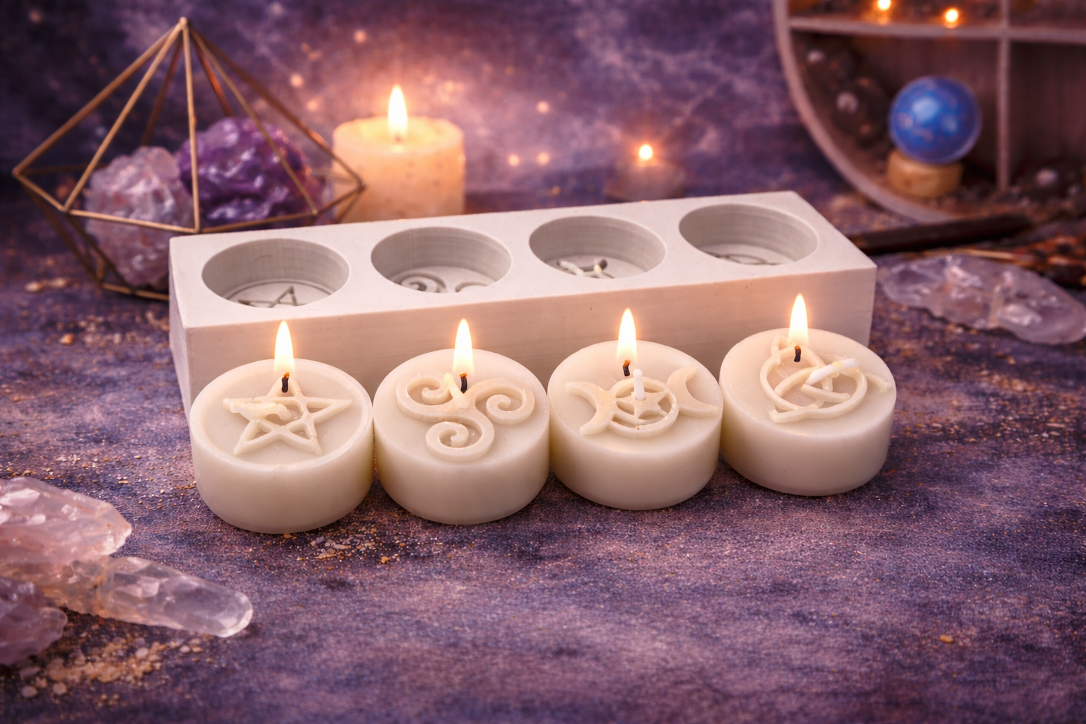 A spirituális mécses 4 darabos szilikon öntőforma egy különleges, tematikus forma, amely lehetőséget ad arra, hogy nemcsak dekoratív, hanem jelentéssel bíró mécseseket készíts. A forma négy különálló mintát tartalmaz, amelyek mindegyike egy-egy spirituális vagy szimbolikus jelentéssel rendelkező motívumot jelenít meg. Ezáltal az elkészült mécsesek nem csupán fényforrásként szolgálnak, hanem egyfajta hangulati és érzelmi üzenetet is közvetítenek.